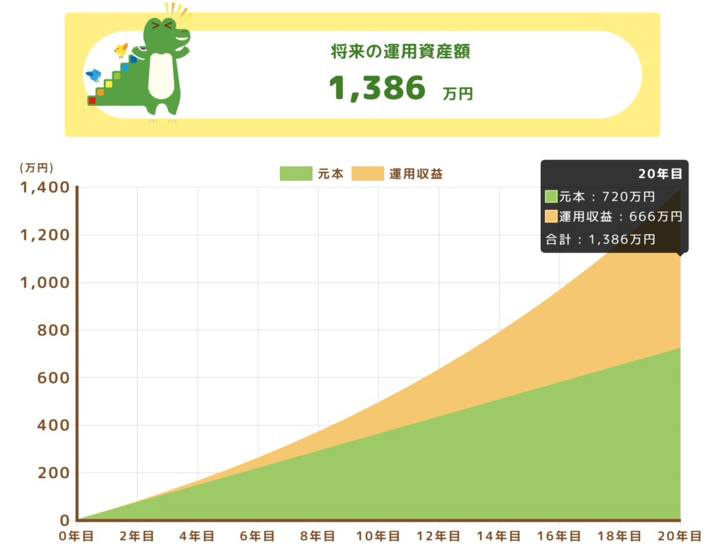画像は、金融庁のウェブサイトにある資産シミュレーターを使用して、毎月3万円を年率6%で20年間運用したグラフです。